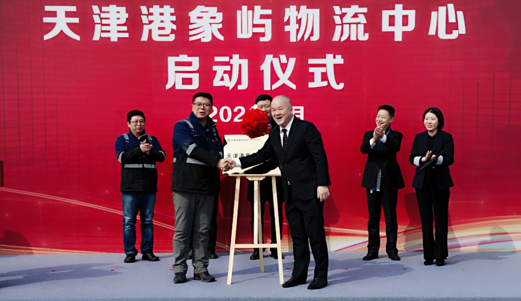 天津港集團業(yè)務經(jīng)營部物流中心主任劉鵬,天津港國際物流黨總支書記、董事長趙明,天津港國際物流黨總支副書記、總經(jīng)理趙毅,象嶼速傳總經(jīng)理孫剛,象嶼速傳副總經(jīng)理胡方等為天津港象嶼物流中心揭牌。