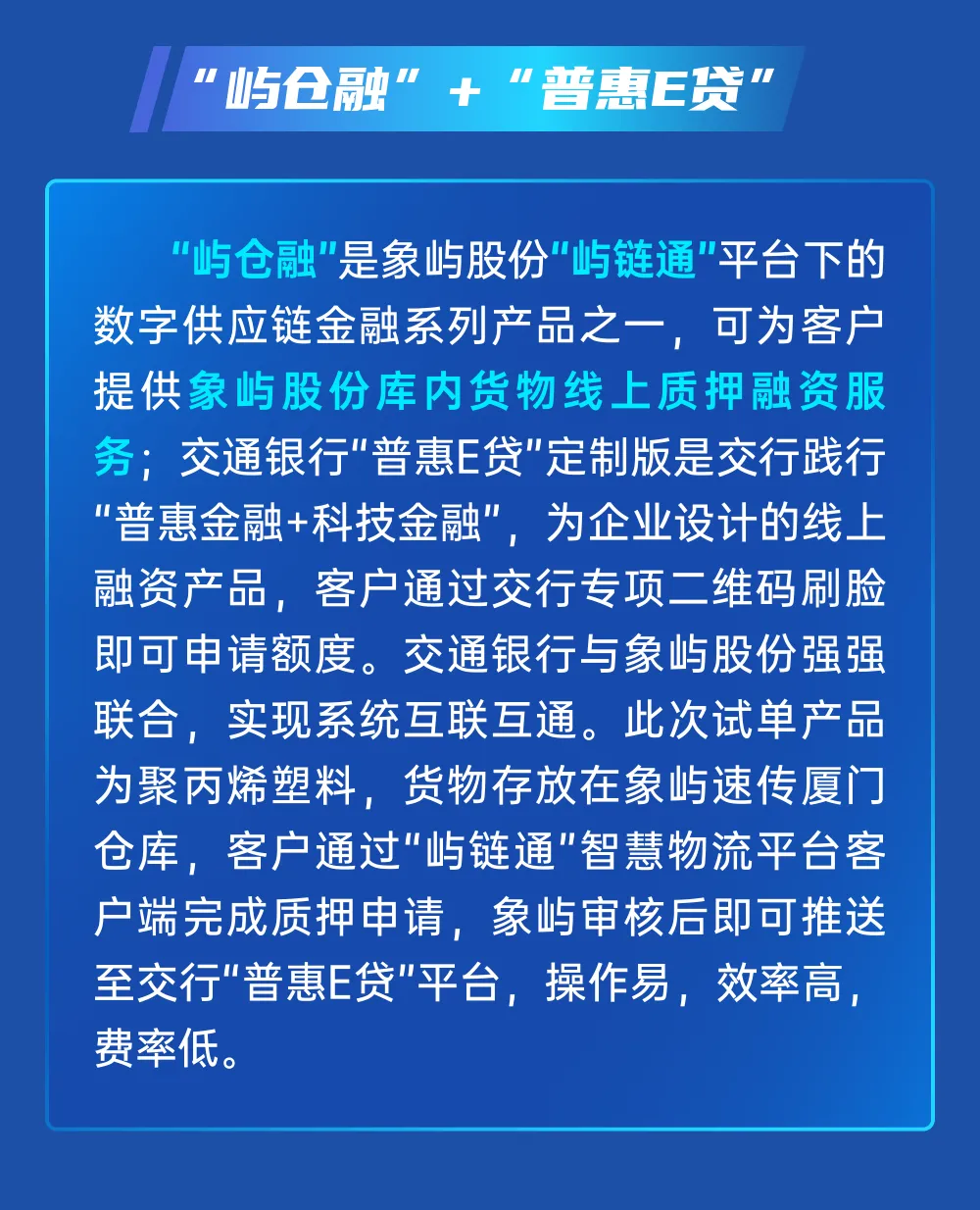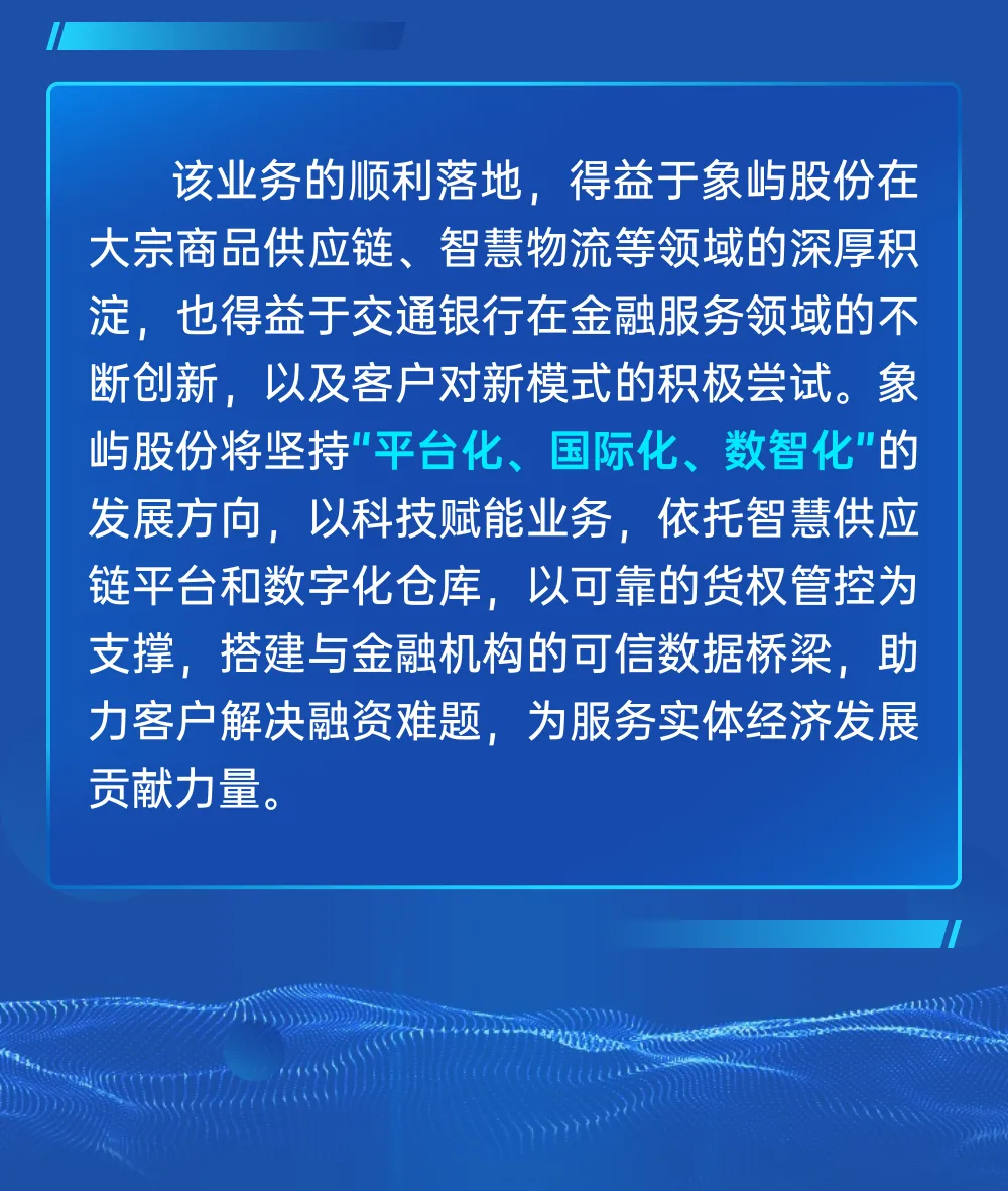 象嶼“嶼倉融”助力交行“普惠E貸”數(shù)字倉單質押融資業(yè)務成功落地!