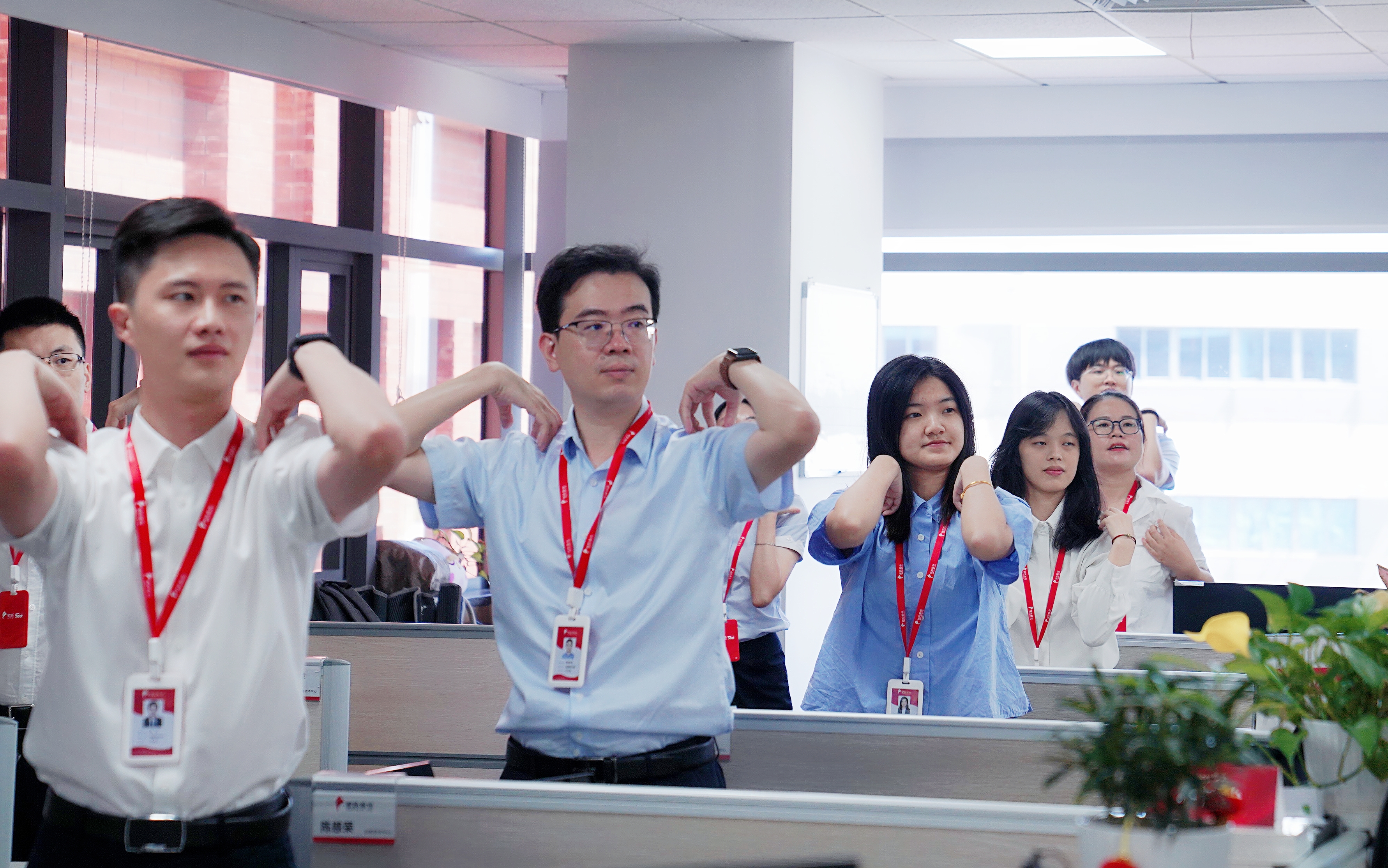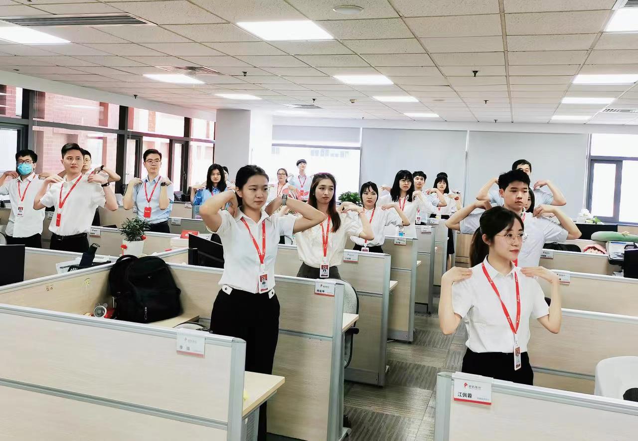 早上十點半,隨著律動音樂的響起,大家紛紛從工位上起身,加入到了活力工間操隊伍中。一二三四,五六七八,二二三四,五六七八……頭部運動、體側(cè)運動、擴胸運動、體轉(zhuǎn)運動……每一個節(jié)拍,每一個動作,無不體現(xiàn)著象嶼人的朝氣蓬勃和積極向上!
