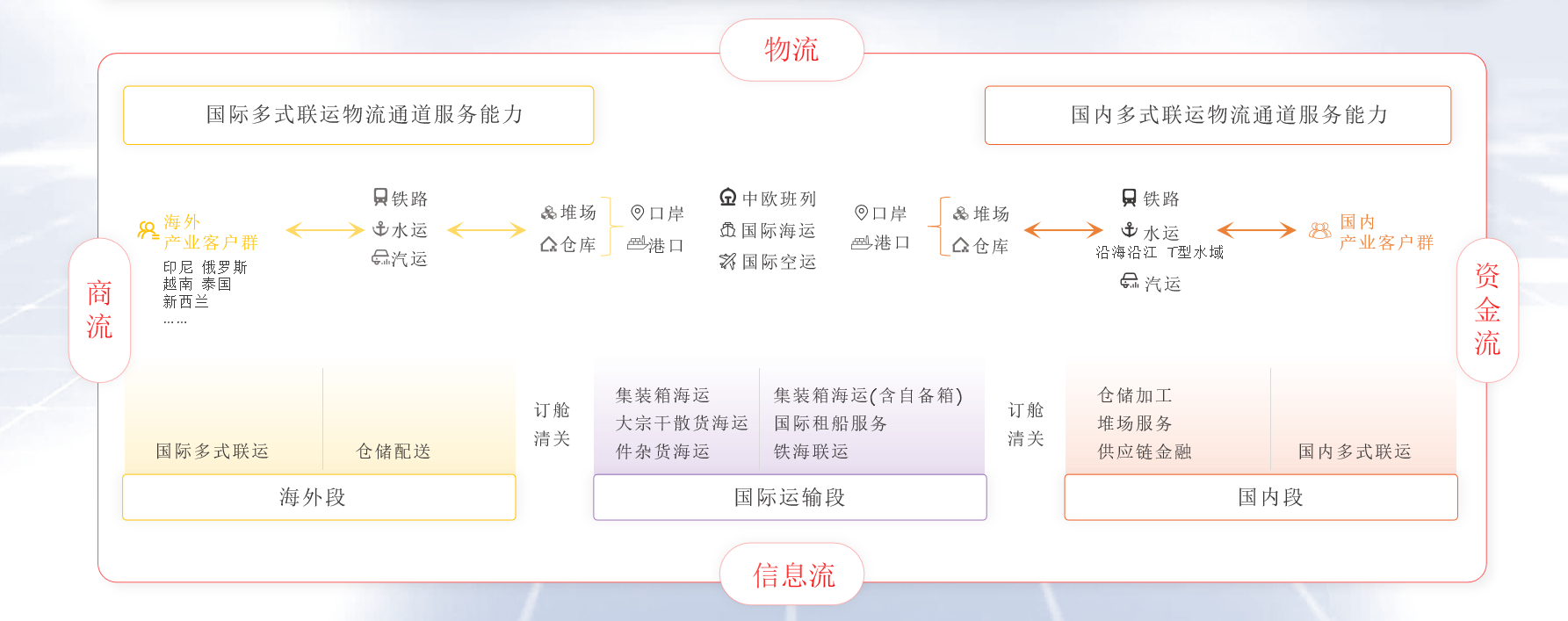象嶼股份率先構(gòu)建了以“公、鐵、水、倉”為支撐,覆蓋全國、連接海外的網(wǎng)絡(luò)化物流服務(wù)體系,并以“鐵、水”做干線、公路做兩端的經(jīng)營思路,為客戶提供定制化多式聯(lián)運(yùn)解決方案,實(shí)現(xiàn)一站式門到門運(yùn)輸。目前,公司已經(jīng)打造出“北糧南運(yùn)”“鋁產(chǎn)品跨省流通”“北煤南運(yùn)”等多條多式聯(lián)運(yùn)物流線路。