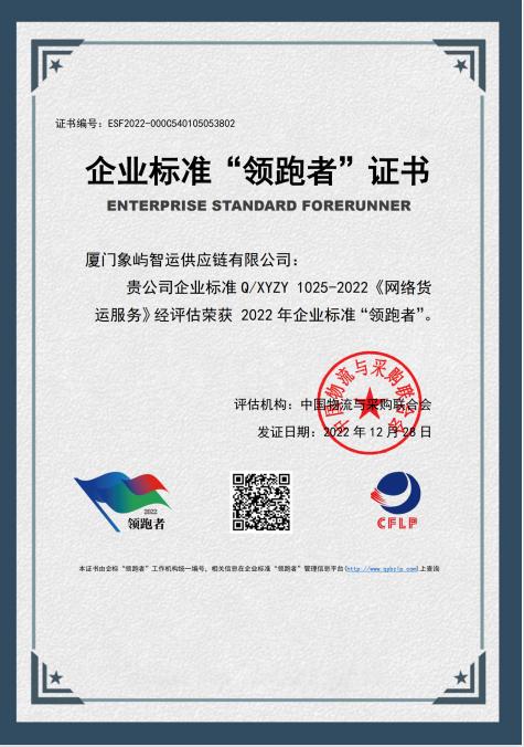 近日,“企業(yè)標(biāo)準(zhǔn)領(lǐng)跑者管理信息平臺”正式發(fā)布“物流服務(wù)”領(lǐng)域首批企業(yè)標(biāo)準(zhǔn)“領(lǐng)跑者”企業(yè)名單。象嶼股份旗下廈門象嶼智運(yùn)供應(yīng)鏈有限公司憑借高水平的網(wǎng)絡(luò)貨運(yùn)服務(wù)質(zhì)量,良好的服務(wù)信譽(yù)以及扎實(shí)的企業(yè)管理體系,榮膺首批網(wǎng)絡(luò)貨運(yùn)服務(wù)“領(lǐng)跑者”。